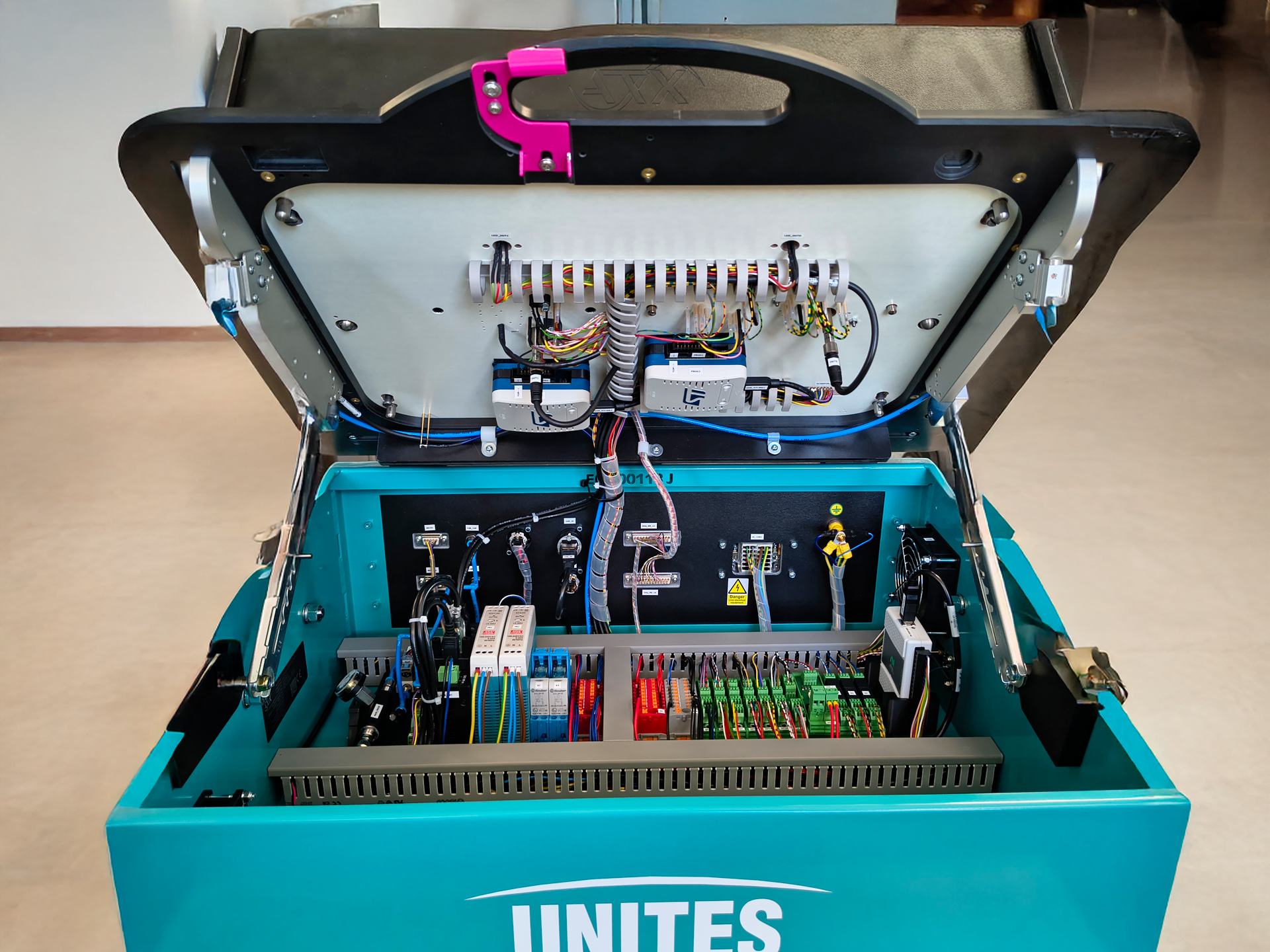 Both devices are tested in a common mechanical fixture and programmed using an ST-Link programmer during the sequence.